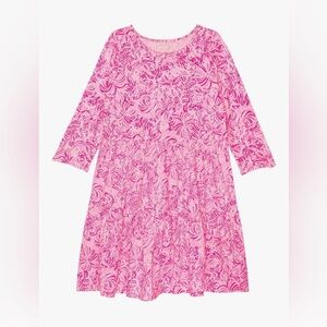 Let your little one enjoy the color and softness and look good wearing Lilly Pulitzer Kids Mini Geanna Dress . Swing dress. Boat neck. Floral print all over. Three-quarter sleeves. Tiers on skirt. 100% cotton