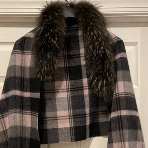 From the Lind Richards Luxury Collection, new without tags. Wool/Cashmere blend plaid wrap with fur collar. Wrap is in brown/camel. Th fur Collar, which is detachable is Genuine North American Raccoon