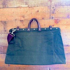 NWOT Pet and smoke free home This thing goes way back. The style was originally used by stonemasons to haul their tools to construction sites — and we figured a mason bag could work wonders for modern times, too. It’s built from thick, capable canvas, with a heavy-duty, reinforced frame. The interior pocket offers enough space to stash a laptop, safely suspending it above the bottom of the bag. The handles and buckles are cut from handsome leather, and a seatbelt-style nylon webbing shoulder strap clips onto reinforced, metal D-rings for secure transport. FEATURES & BENEFITS – A hardy tool-style duffel inspired by old-school stonemasonry gear Durable cotton canvas is mated to a reinforced metal frame with metal hardware and feet Sturdy leather handles and removable nylon webbing shoulder strap Interior pocket fits up to a 15” laptop, 13” for bulkier ones SPECS – (L) 21" x (H) 13" (excluding handle) x (W) 7"