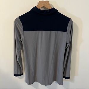 Features: button front, long sleeves, color blocking at collar and sleeve trim
