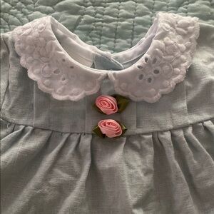 This charming blue matching set features a diaper cover with elastic leg openings for a snug fit. Crafted from soft, lightweight linen, it offers both comfort and style. The classic design is enhanced with delicate details, making it a perfect choice for any occasion.