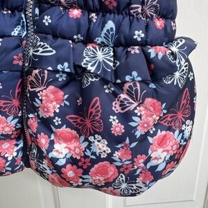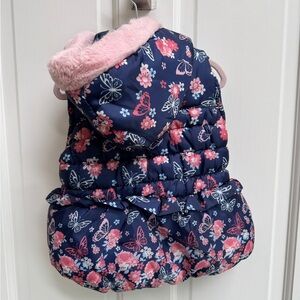 Charming girls puffer vest with a floral and butterfly pattern. Features a soft pink fur collar. Perfect for adding a touch of whimsy to any outfit.