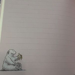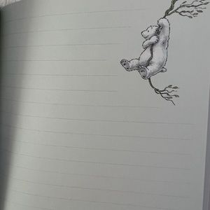 Hard-back journal with lined pages in pastel colors - lavender, blue, yellow, green and an attached ribbon bookmark. Each page of the journal has a small drawing of Lars (see examples in photos) based on the book series "The Little Polar Bear" by Hans de Beer which has been published in 18 languages and in 27 countries.