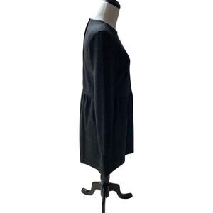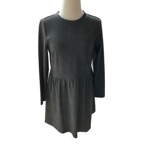 This is a new, without tag dress. It features long sleeves, a flattering gathered waist, loose fit and a unique button back accent. Colors are black/dark gray/white.