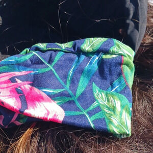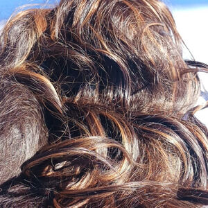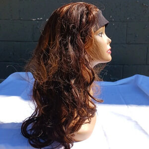 never worn light and dark brown long layered synthetic wig with 1 black cloth headband and tropical pattern headband. looks and feels real. approx 27 inches long. beautiful wig, for everyday wear or special occasions