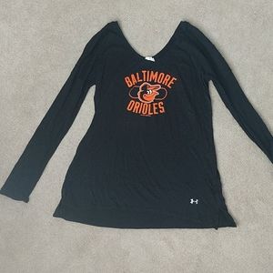 Never worn black long sleeve under armour heat gear T-shirt with Baltimore Orioles logo on front