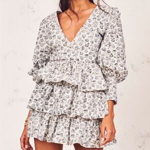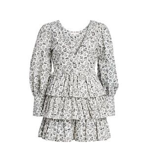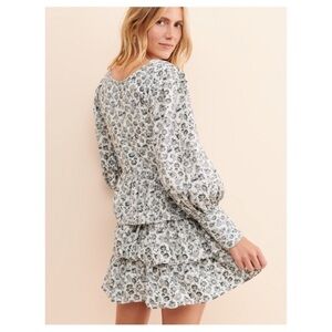 NWOT LoveShackFancy Paris Grey Floral Ruffle Tiered Long Puff Sleeve Mini Dress