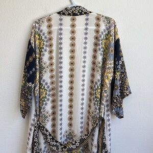 A bohemian lounge duster robe in a vintage-inspired ivory and lilac patchwork floral print.