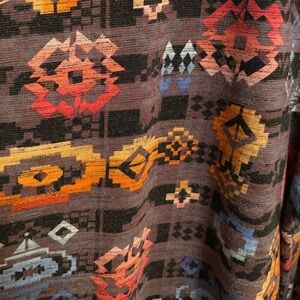This LuLaRoe Lynnae long sleeve tee vibrant print features a charcoal gray base color with an “Aztec” inspired pattern in shades of blue, orange, and red. The soft and stretchy knit fabric drapes well on the body.