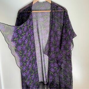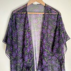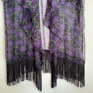 NWOT LuLaRoe ‘Monroe’ Sheer Kimono w/ Fringe, Black w/ Purple Flowers Size L