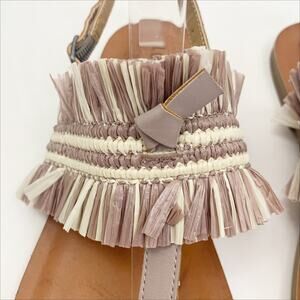 New without tags. Lucky Brand Akerlei Raffia Fringe Flat Sandals. Flat thong sandals with mauve and cream raffia fringe detail. Adjustable ankle strap. Size 8.5. A few small scratches on soles from being tried on. See photos.