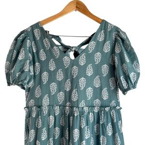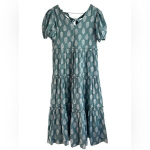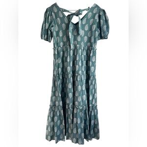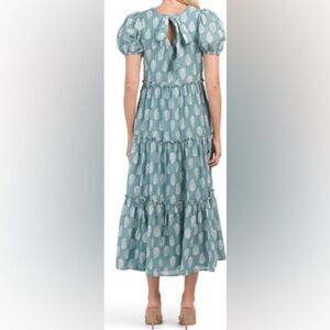Beautiful floral tiered maxi dress with puff sleeves and bow detail on the back.