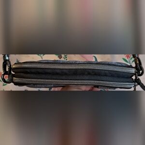 In unused condition. Has an adjustable strap. Two separate zipped compartments. One compartment has a zippered area inside. It also has belt loops on the rear if you care to wear it that way. 7.5×5×1.5.