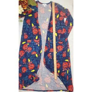 This beautiful LuLaRoe Sarah Cardigan Duster in size S is perfect for any occasion and looks great with jeans. The collarless and lightweight design make it ideal for travel, while the tight-knit polyester blend material offer comfort, warmth, and style for the fall and winter seasons. The cardigan features an open front and raglan sleeves, with pockets for added convenience. The bright pattern adds a pop of color to any outfit, making it a perfect addition to any wardrobe.