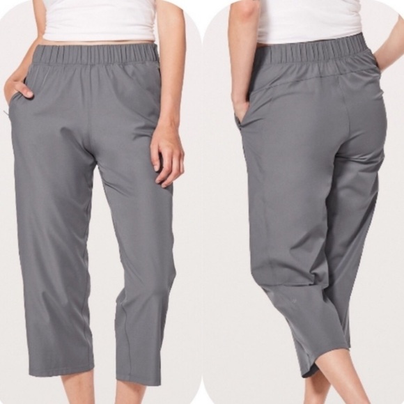 Zipper pocket: Store your stuff in the secure zippered pocket Inseam: 23", The relaxed fit, casual twill texture, and quick-drying Swift fabric make these crops the perfect travel companion, Elastic comfy waistband. Zipper pockets on the hips. Lulu symbol on the left, no trades