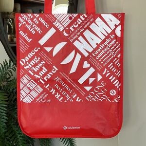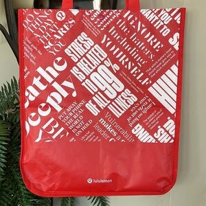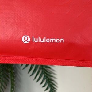 NWOT Lululemon Red Reusable Shopping Tote Double Handle Shoulder Bag Lightweight Sporty. Snap close. Approximately 16.25” x 14” x 6.5”.
