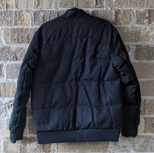 New without tags Roam Far Wool Bomber Jacket in Black/ Heathered Black from Lululemon. Defy the cold in this reversible, down-filled bomber. Designed with waterproof Technical Wool to keep you shielded from the elements, you'll stay seriously warm no matter which way you wear it. Glyde fabric is water-repellent to protect you from light rain. Water-repellent. 100% of Lululemon down is certified to the Responsible Down Standard (RDS) by Control Union (No. 847515). No flaws.