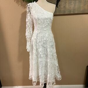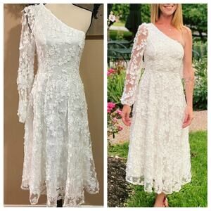 NWOT Lulus Eloquent Elegance White Embroidered Lace One-Shoulder Midi Dr…