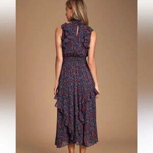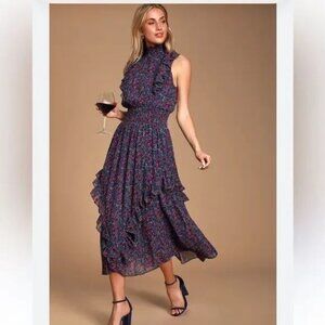NWOT Lulus Evalina Navy Blue Floral Print Mock Neck Midi Dress