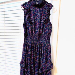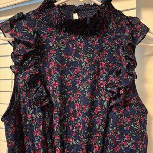 Sweet feminine deets make the Lulus Evalina Navy Blue Floral Print Mock Neck Midi Dress a favorite! A smocked, mock neckline starts off this frilly frock with ruffled shoulders, a sleeveless bodice, and a pretty navy blue, magenta, and green floral print. Flowy woven chiffon shapes a smocked waist and midi skirt, punctuated with ruffled tiers. Back keyhole with two top buttons.