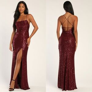 NWOT Lulus Evenings of Elegance Burgundy Sequin Lace-Up Maxi Dress