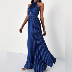 NWOT Lulus Midnight Moves Navy Blue Pleated Satin Cutout Halter Maxi Dress