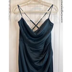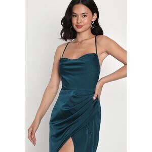 NWOT Lulus Moments of Beauty Dark Teal Satin Cowl Neck Tulip Maxi Dress Size L