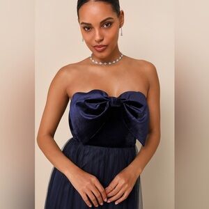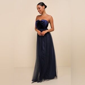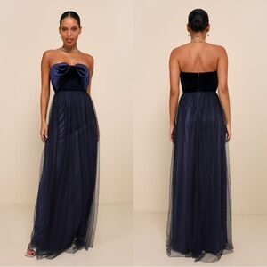 NWOT Lulus Perfectly Dramatic Navy Velvet Tulle Strapless Bow Maxi Dress