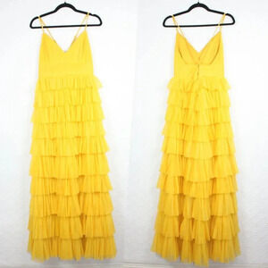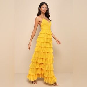 NWOT Lulus Radiant Event Yellow Mesh Tiered Ruffled Backless Maxi Dress
