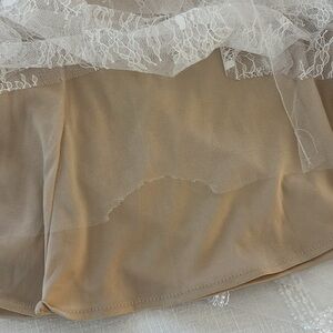 Beige stretch knit, a white lace layer, and an intricately beaded overlay