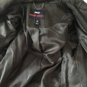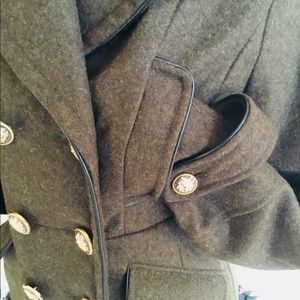 *2 side pockets on each side (photo #5), 2 little front pockets at front top (photo #6). Faux leather trim, 60% wool, 40% viscose.