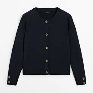 This Massimo Dutti cardigan is a sophisticated knitwear piece crafted in a deep navy blue color. It features a V-neck design (as seen in the real item images) and is accented with statement gold-toned snap buttons embossed with a crest-like motif, adding a refined touch.