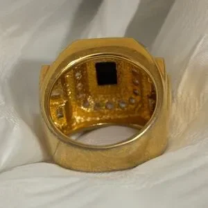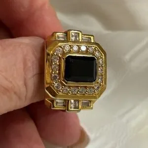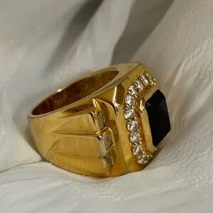 Brand New - Stunning men’s dress ring with black stone in middle surrounded by clear stones and set in 10k gold plate over steel. Could easily be gender neutral- statement ring. Retails for $160.00 size 9
