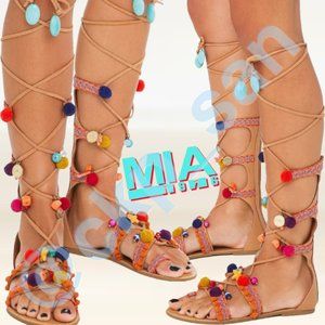 New without tag, MIA Reanna Pom Pom Gladiator Sandals Sz 9. Perfect for summer season with a cute dress or shorts. Adorable pom pom sandals in vibrant colors with a classic gladiator wrap up design and beautiful beads and charms on a leather string. Zip closure in back and straps are adjustable to fit any leg. Vegan leather. Fits true to size, brand new, never worn, no box, without tag. Please see pictures for details, condition. Sold out in stores.