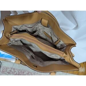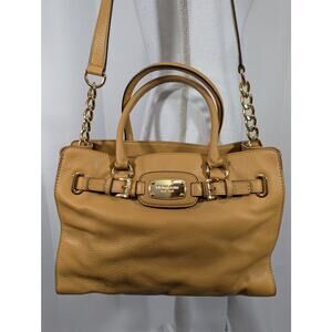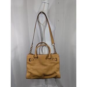 From Michael Kors, a deliciously luxe genuine leather bag, purse, shoulder bag, handbag, in almond tan! Hefty and large, approx 14" x 11" x 4", it has both handles and a shoulder strap! Strap with gold chain- approx 36", 17" drop, and the handles are 16" with a 6" drop! Outside gold harness buckle logo detail, inside- 3 compartments, 2 open separated by a zipper compartment! A gorgeous bag! ***NEW Without Tags, and Guaranteed Superb by Lily @HauteClub!* *Measurements always available on request!*