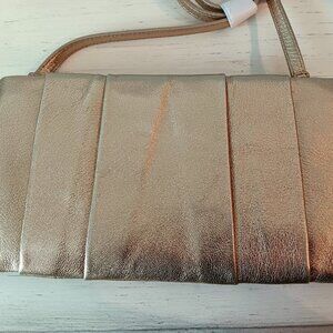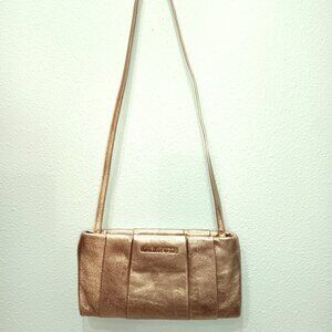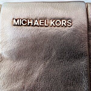 This gold metallic Michael Kors crossbody bag is adorable. Very pretty shade of gold, pleated in the front and back, Michael Kors logo metal plate on the front. Comes with detachable long crossbody strap so you can use the bag as a clutch. Very pretty bag!