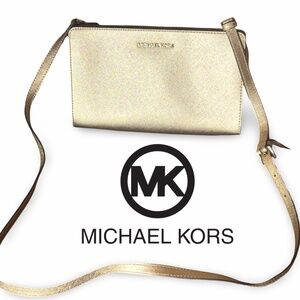 New without tags this Jet Set Travel crossbody bag is the complete package. Crafted from shimmering metallic Saffiano leather, it features an adjustable shoulder strap that can be removed and carried as a clutch for added versatility. Chic yet practical, it opens up to a spacious interior, designed to keep essentials organized.