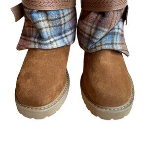 These boots are so versatile. Wear them belted with the flannel sleeve, plain as just a suede boot, or rolled, exposing the inner flannel plaid lining. Three pairs of boots in one! Please note these are new without tags, but they do have a few marks on the side soles. See photos.