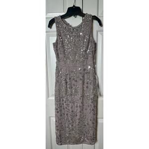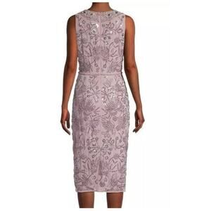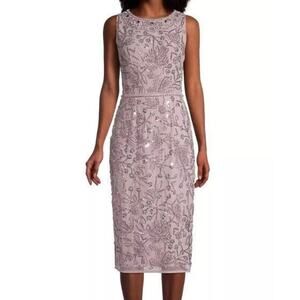 Vintage-style lilac midi dress with sequins, intricate beadwork, and rhinestones at the natural waistline.