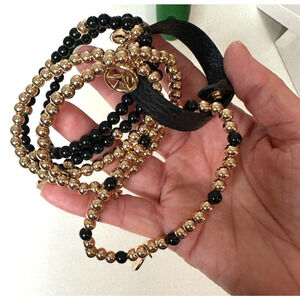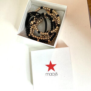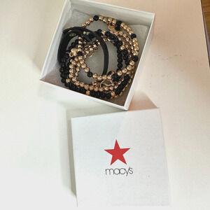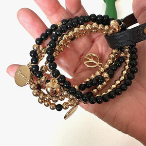 Macy's Black & Gold Multilayered Stretchy Skull Hearts Peace Beaded Leather Wrap Bracelet