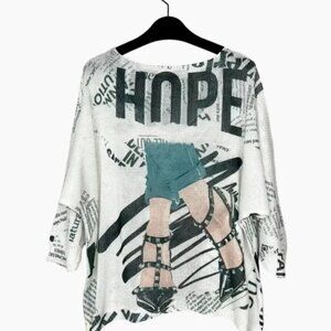 Made in Italy oversized graphic print knit top featuring bold newspaper text and an artsy “HOPE” design. Lightweight, semi-sheer fabric with a slouchy, relaxed fit. Dolman sleeves, scoop neckline, and a slightly high-low hem make it perfect for layering over a cami, tank, or bralette.