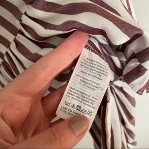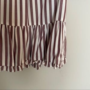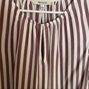 Madewell ruffle hem blouse in the style Stanza. Muted red and white striped, short sleeves, and keyhole cutout on front neckline.