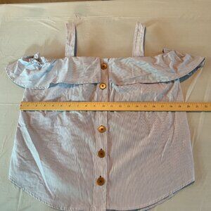 Maeve top, blue striped top, off-shoulder blouse, ruffle detail top, button-down top, women's summer top, casual cotton top, Maeve size L, Anthropologie top, striped ruffle blouse, lightweight women's top, Maeve shirt, blue and white top, date night, party, event, girls weekend, summer, winter, fall, spring