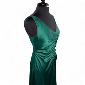 New without tags. This Maggy London sleeveless midi dress in a stunning emerald green satin is effortlessly elegant. Features a ruched front for a flattering silhouette and a bias-cut skirt for beautiful movement. Perfect for wedding guests, cocktail parties, holiday events, or any occasion where you want to turn heads.