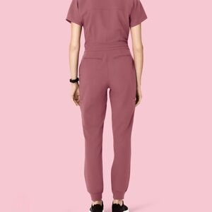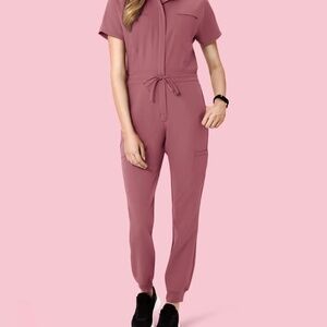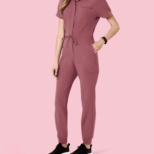Fashion Meets Functionality with Mandala Women's Scrub Jumpsuit in the mauve colorway featuring a stylish mandarin collar neckline with drop shoulders and a straight leg design. New without tags and in an overall excellent new condition! The jumpsuit is cut from spill resistant, 4-way stretch, breathable fabric and feature a straight leg design with a pullover closure and adjustable drawstring at the waist with versatile pockets.