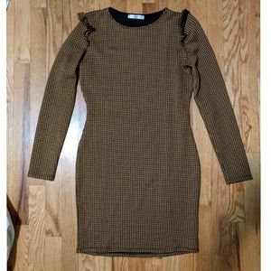 Sheath dress with ruffle detailing on shoulders. Check print in black and mustard yellow. Size large. Fits like a small or medium. Measurements across bust 17"/waist 14"/ length 33". Material is stretchy. Perfect condition.