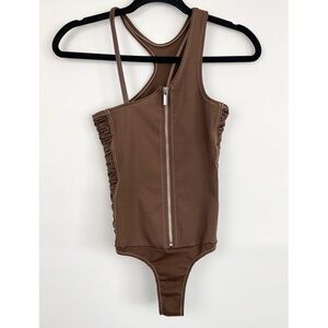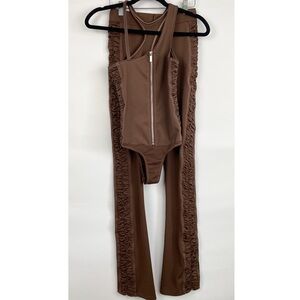 NWOT Maniere De Voir Brown Ruched Side Bodysuit + Flared Legging Pants Set - 6
