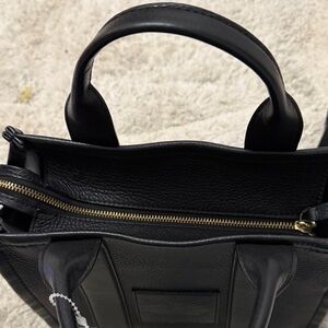 Elegant black leather tote by Marc Jacobs. Features dual handles and detachable strap.