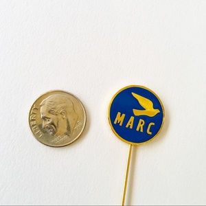 This brooch features gold tone finish, blue enamel with a "MARC" logo and a bird.