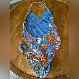 Brighten up swim time with this vibrant floral one-piece swimsuit. Featuring a stunning blue and orange pattern, it's perfect for fun in the sun.